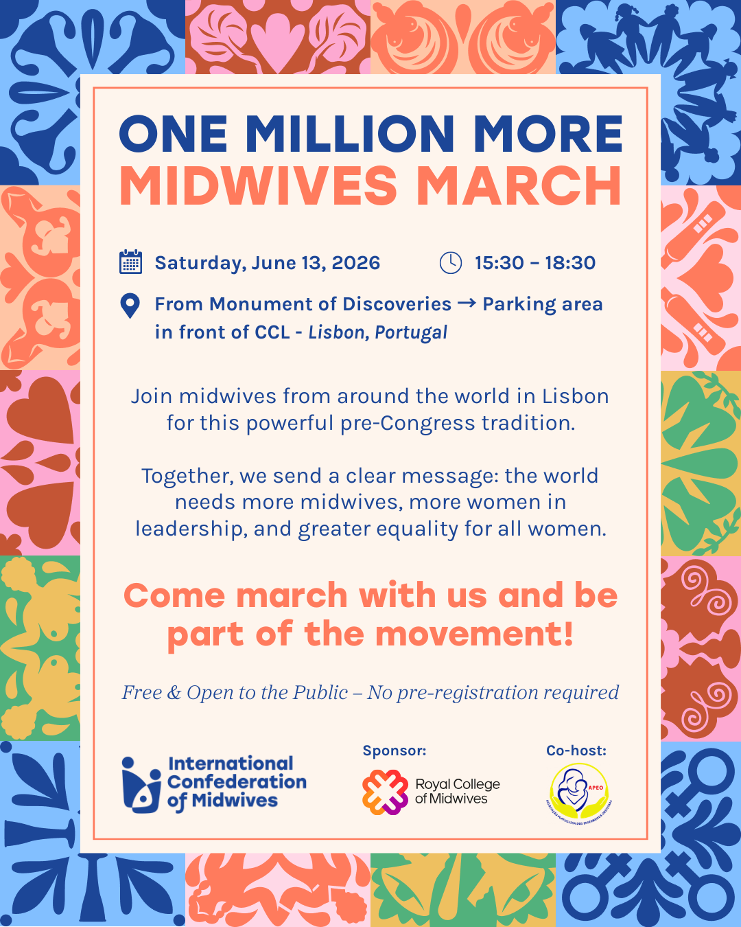 Alineado con nuestra campaña de firma de la petición y con el tema de la IDM, el tema del 34º Congreso de la ICM es Un millón de matronas más. Esto refleja la continuidad de nuestro movimiento global: desde el lanzamiento de la petición en 2025 hasta un gran impulso de promoción en el Día Internacional de la Matrona y un momento final de unidad global en el Congreso.