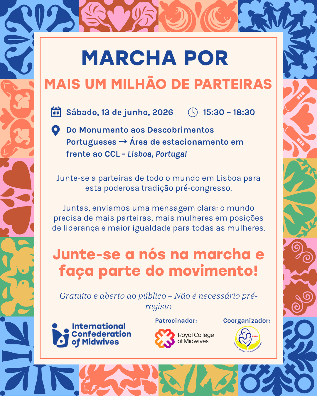 Junte-se a parteiras de todo o mundo em Lisboa para a poderosa Marcha das Parteiras, uma tradição de longa data pré-congresso e um momento para nos unirmos em prol de Mais Um Milhão de Parteiras. De Durban a Praga, de Toronto a Bali, continuamos o legado – celebrando a solidariedade, a liderança e o empoderamento.
